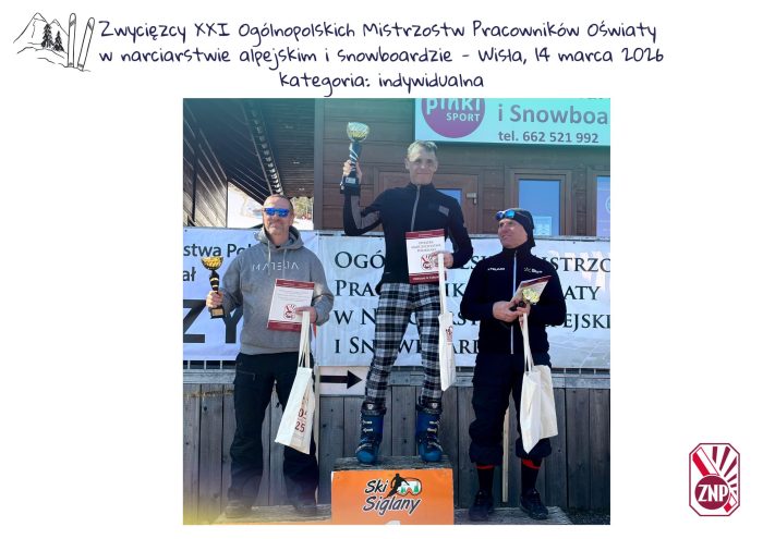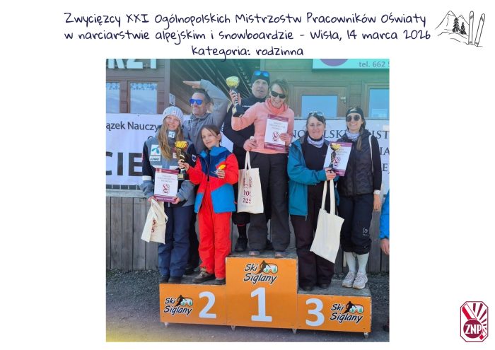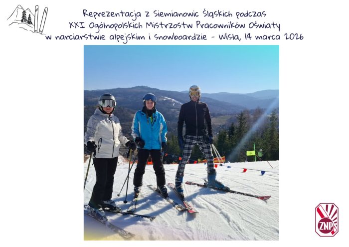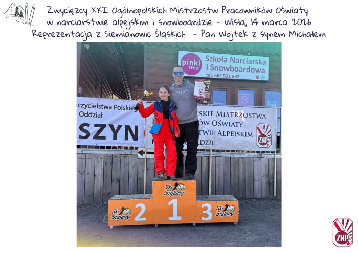 W sobotę 14 marca 2026 w Wiśle odbyły się XXI Ogólnopolskie Mistrzostwa Pracowników Oświaty i ich rodzin w narciarstwie alpejskim i snowboardzie. Organizatorem imprezy był Oddział ZNP w Cieszynie. Nasz siemianowicki Oddział doskonale reprezentowały 2 drużyny z Ogniska nr 6, które wywalczyły miejsca na podium. W rozgrywkach indywidualnych I miejsce zajął kol. Wojciech Frąckowiak, natomiast Tomasz Ligocki uplasował się na II miejscu. W konkurencji rodzinnej wygrana przypadła rodzinie Frąckowiak. Serdecznie gratulujemy i jesteśmy z Was dumni.